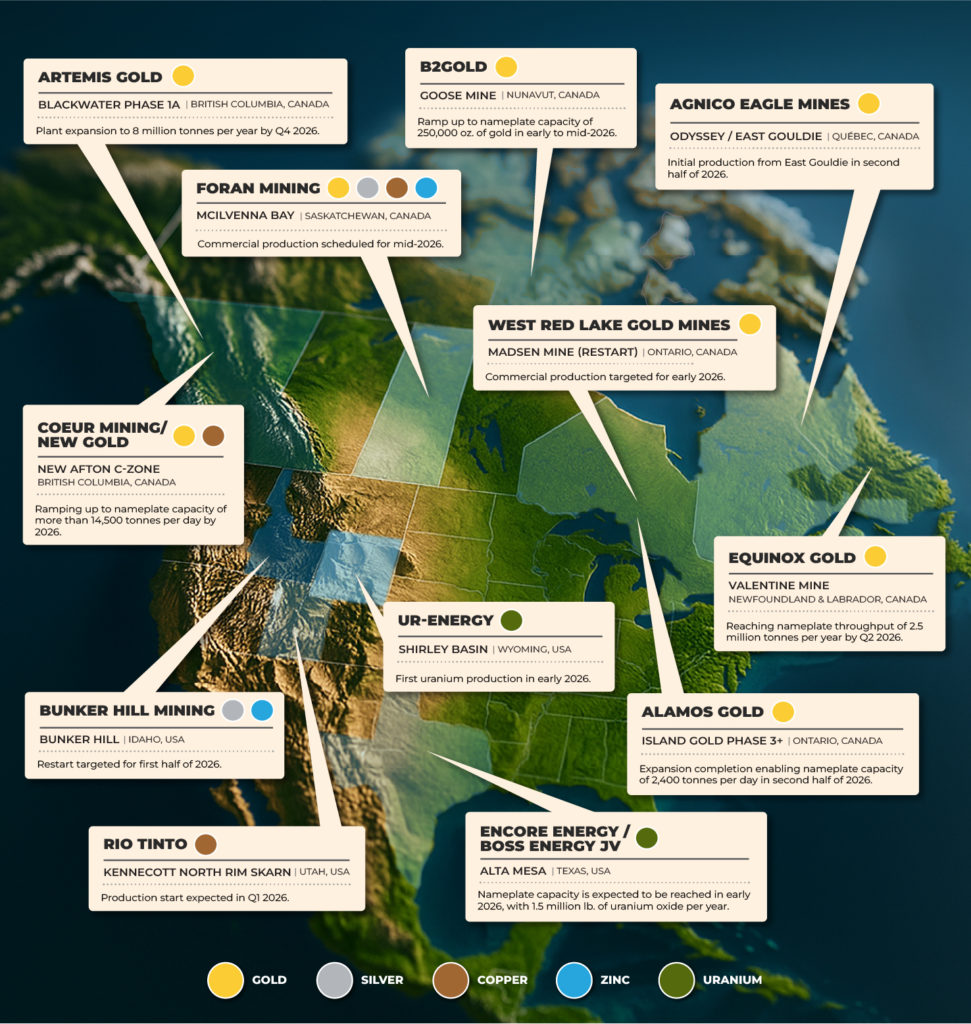 As 2025 comes to a close, The Northern Miner looks ahead to 12 projects across North America on track to reach mining milestones in 2026. From precious and critical metals mines across the vastness of Canada to uranium mines further south in the U.S., the milestones cover the start of production, commercial production, production restarts and ramp ups to nameplate capacity.